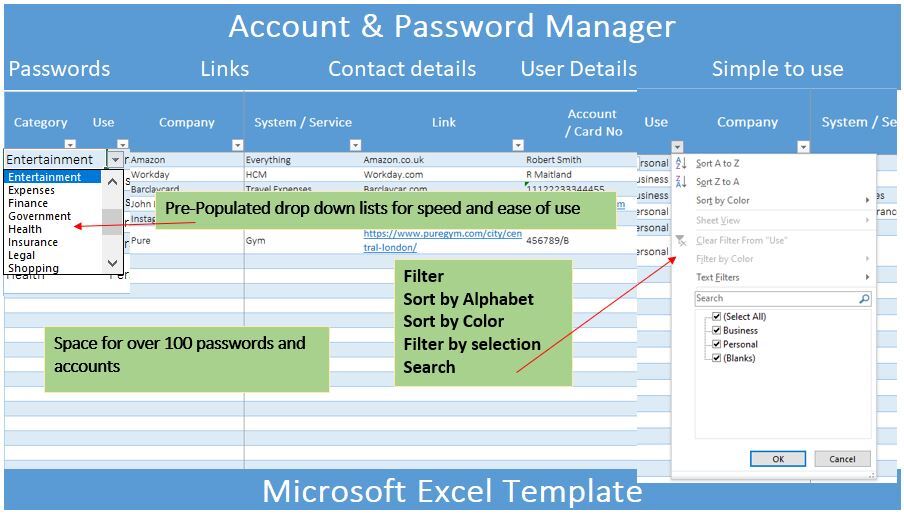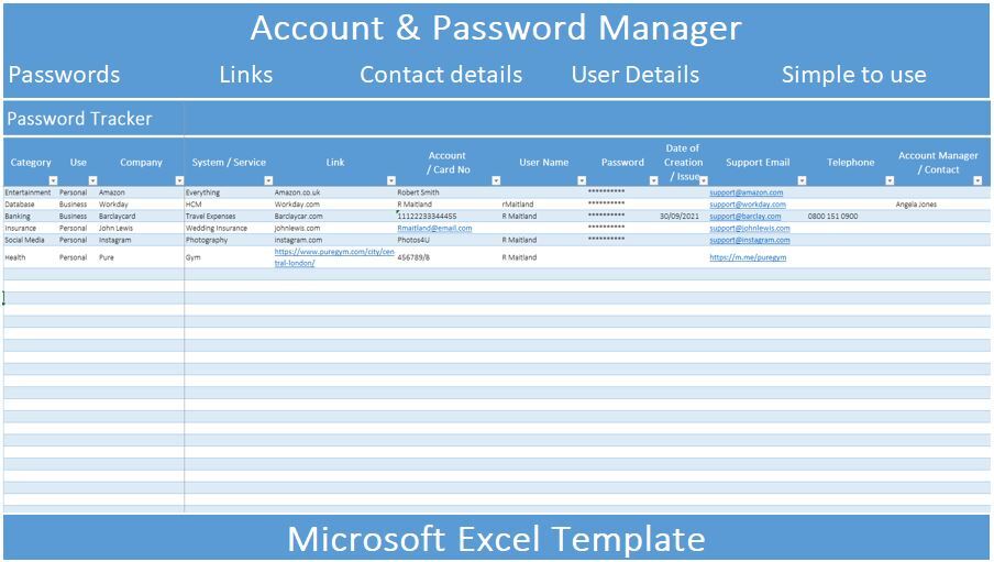 Simple Account & Password Tracker Template for Microsoft Excel.